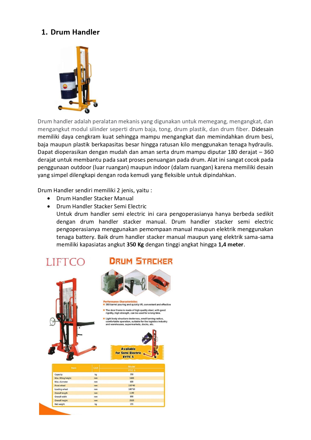 Biasanya digunakan ditiap perusahaan yang memiliki gudang Chemical, Oli, Solar , Zat Aditif atau kemasan Drum cairan lainnya. sebelum diteruskan oleh alat pengangkut lain atau telah menjadi tujuan akhir. Alat ini ada bermacam model, ada yang 1 drum sekali angkat, ada 2 drum sekali angkat dengan jenis drum besi atau plastik. Dengan kapasitas yang sesuai
